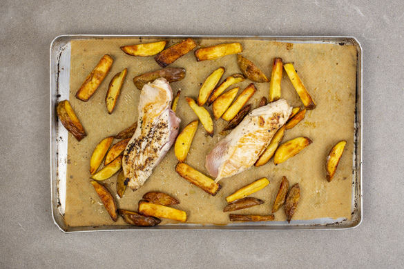 Das Fleisch zu den Kartoffeln auf das Blech geben und 8–10Min. mitbacken, bis es in der Mitte durchgegart ist. Das Fleisch aus dem Ofen nehmen und etwas abkühlen lassen.