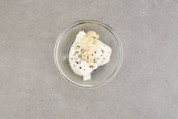 Die Crème fraîche mit der Mayonnaise verrühren und mit 1–2TL Essig sowie Salz und Pfeffer abschmecken. Die Baguettebrötchen im Ofen 2–4Min. knusprig aufbacken.