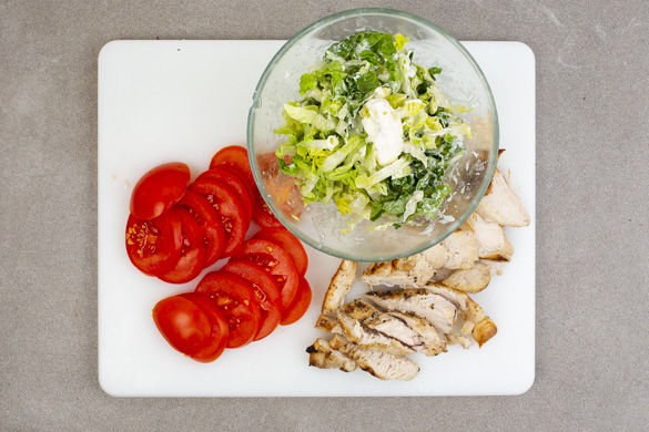 Die Tomaten in dünne Scheiben schneiden, dabei den Strunk entfernen. Den Eisbergsalat in feine Streifen schneiden und mit 2–3EL der Mayocreme vermengen. Das Fleisch schräg in dünne Scheiben schneiden.