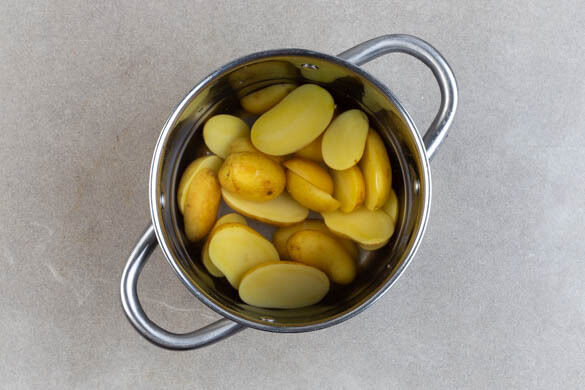 Die Kartoffeln samt Schale je nach Größe halbieren oder vierteln und in einen mittelgroßen Topf mit ausreichend gesalzenem Wasser geben, das Wasser aufkochen. Die Kartoffeln bei mittlerer bis niedriger Hitze 15–18Min. kochen, bis sie gar sind, anschließend in ein Sieb abgießen.