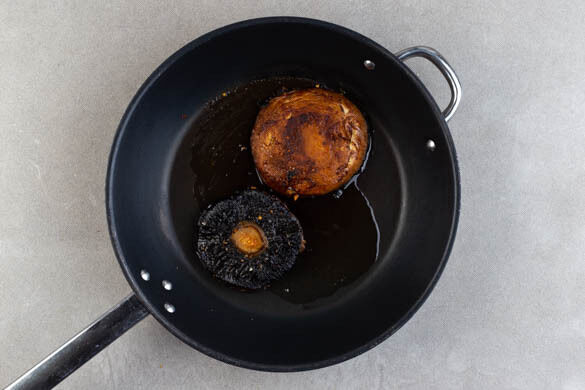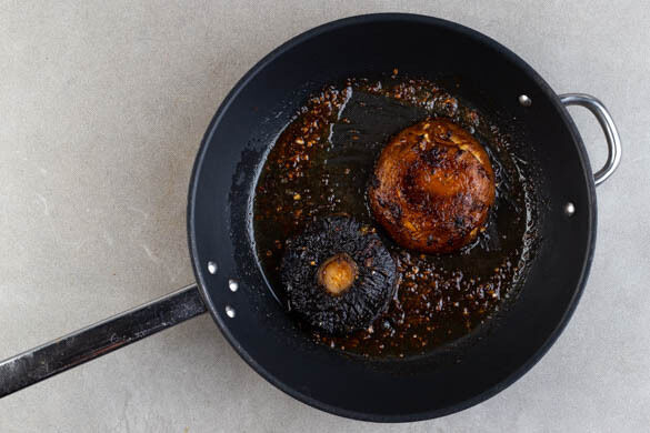 Ggf. vorhandene Pilzstiele abtrennen. Die Pilze mit den Lamellen nach unten in der ersten Pfanne mit ½EL veganer Margarine bei mittlerer bis starker Hitze 4–6Min. braten, dabei mit einem Pfannenwender flach drücken, damit sie gleichmäßig garen. Die Pilze wenden und weitere 2–4Min. braten, bis sie appetitlich gebräunt und weich sind.