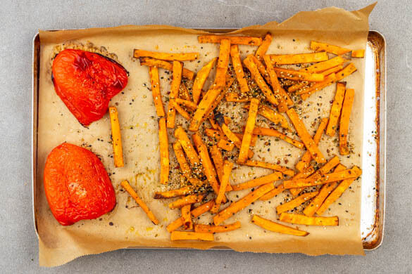 Das Backblech aus dem Ofen nehmen und die Süßkartoffeln und die Paprika mit ¾ der Gewürzmischung vermengen.