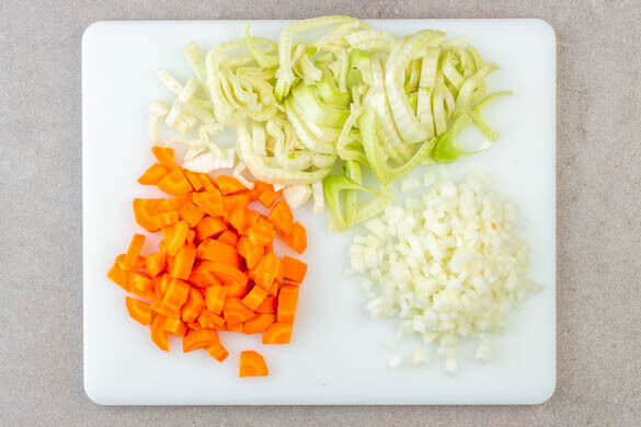 In einem großen Topf ausreichend gesalzenes Wasser für die Pasta zum Kochen bringen. Die Zwiebeln schälen, halbieren und fein würfeln. Die Karotten ggf. schälen, längs vierteln und schräg in dünne Scheiben schneiden. Den Fenchel längs halbieren. Das Strunkende und die Stiele entfernen und den Fenchel quer in dünne Scheiben schneiden.