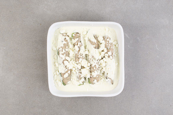 Die Gurken mit der Hackmasse füllen und in eine Auflaufform geben. Den Käse mit den Fingern grob zerbröseln und auf den Gurken verteilen. Die Sauce um die Gurken angießen. Im Ofen 20–25Min. backen, bis das Fleisch und die Gurken gar sind.