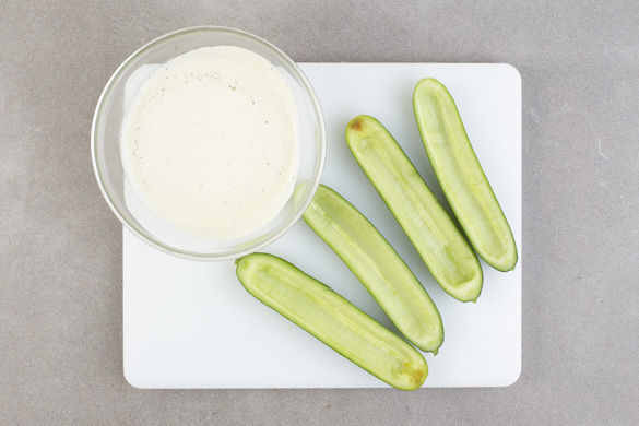 Den Backofen auf 220°C Umluft (240°C Ober-/Unterhitze) vorheizen. Die Gurken längs halbieren und mit einem kleinen Löffel das Kerngehäuse auskratzen. Dieses und 1,5 Päckchen Senf mit einem Stabmixer pürieren. Die Sauce mit der Crème fraîche verrühren und mit Salz und Pfeffer abschmecken.