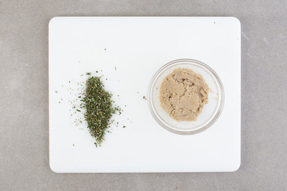 Die Rosmarinnadeln abzupfen und fein schneiden. Die Semmelbrösel in 60–70ml Wasser einweichen.