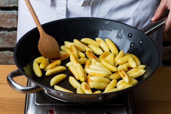 Die Schupfnudeln in einer großen Pfanne mit 1–2EL Olivenöl bei starker Hitze gleichmäßig goldbraun anbraten. Aus der Pfanne nehmen und warm halten. Je nach Pfanne ggf. in mehreren Durchgängen arbeiten, sodass nie zu viele Schupfnudeln in der Pfanne sind und sie gleichmäßig bräunen können.