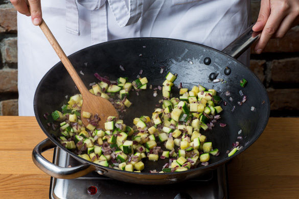 Die Zucchini in ca. 1cm kleine Würfel schneiden und mit den Zwiebeln in der Pfanne mit 1EL Olivenöl bei mittlerer Hitze ca. 5Min. anbraten. Währenddessen den Schinken in ca. 1cm kleine Stücke schneiden.
