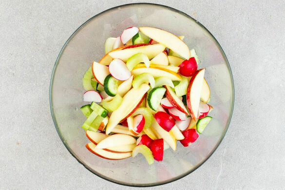 Den Sellerie in dünne Scheiben schneiden. Die Gurke längs halbieren, die Äpfel vierteln und entkernen und beides ebenfalls in dünne Scheiben schneiden. Die Radieschen vierteln und mit dem Sellerie, der Gurke und den Äpfeln vermengen.