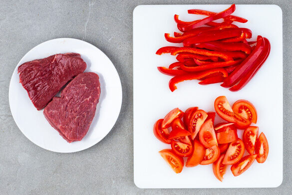 Den Backofen auf 240°C (220°C Umluft) vorheizen. Das Fleisch auf einen Teller legen und Raumtemperatur annehmen lassen. Die Paprika vierteln, entkernen und in dünne Streifen schneiden. Die Tomaten in Spalten schneiden.