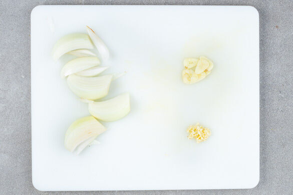 Die Zwiebel schälen, halbieren und in dünne Spalten schneiden. Den Knoblauchschälen und halbieren, eine Hälfte in dünne Scheibchen schneiden, die andere Hälfte fein würfeln.