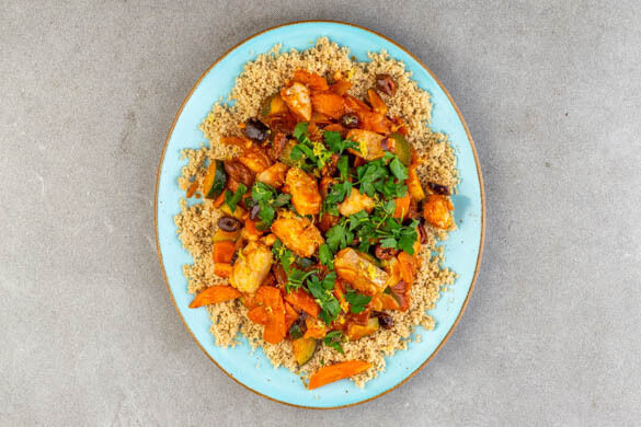 Nichts macht schneller gute Laune als ein köstliches, ausgewogenes und farbenfrohes Mahl, oder? Deshalb präsentieren wir heute: saftige Seelachsstücke, sanft gegart in einer Melange aus Tomaten, Zucchini, Kartotten und Oliven. Verfeinert wird die Sauce mit einer raffinierten Gewürzmischung, frischer Petersilie und Zitrone, gebettet wird der bunte Schmaus auf lockerem Couscous. So einfach geht das mit dem Genießen!