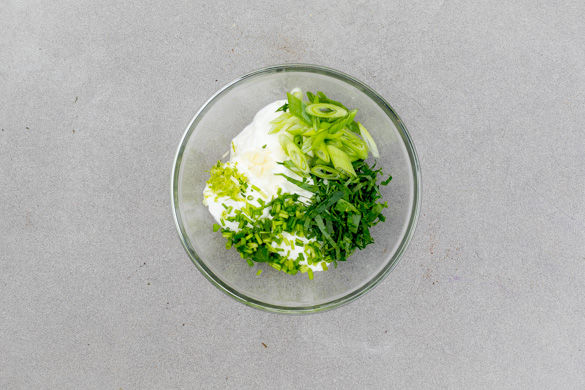 Den Schnittlauch in feine Röllchen schneiden. Die Petersilienblätter abzupfen und fein hacken. Die Dillspitzen von den Stängeln zupfen und grob schneiden. Die Limettenschale abreiben, dann die Limette halbieren und auspressen. Die Lauchzwiebel schräg in feine Ringe schneiden. Den Knoblauch schälen und fein würfeln.