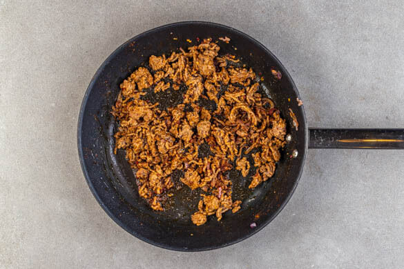 Das Hackfleisch und die restlichen Zwiebeln in einer mittelgroßen Pfanne mit 1EL Olivenöl bei mittlerer Hitze 3–5Min. krümelig anbraten. In der letzten Minute die Gewürzmischung einrühren und 1Min. mitbraten. Ggf. mit Salz und Pfeffer abschmecken.