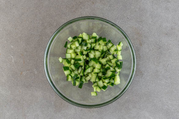 1EL Essig und ½TL Salz verrühren, bis sich das Salz aufgelöst hat. Die Gurke längs vierteln, in kleine Würfel schneiden und mit dem Essig vermengen.