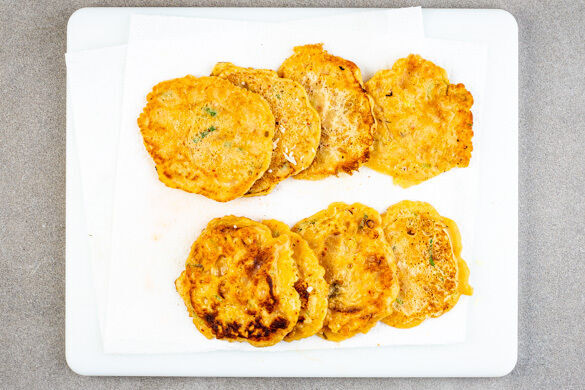 In einer großen Pfanne 1EL Pflanzenöl bei mittlerer Hitze erwärmen. 2–3EL Teig portionsweise für jeden Pancake in die Pfanne geben und jeweils 2–4 Pancakes 2–3Min. garen. Dann wenden und weitere ca. 2Min. backen, bis die Pancakes gar und goldbraun sind, ggf. die Hitze etwas reduzieren. Insgesamt 8 Pancakes ausbacken und auf etwas Küchenkrepp abtropfen lassen.