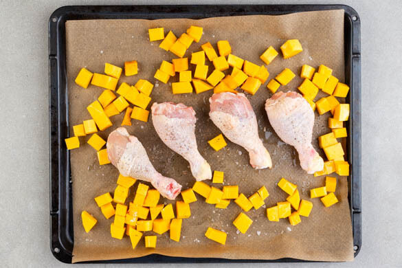 Den Backofen auf 240°C (220°C Umluft) vorheizen. Die Kürbisse schälen, mit einem Löffel entkernen und in 1–2cm große Würfel schneiden. Die Drumsticks trocken tupfen und mit dem Kürbis auf ein mit Backpapier ausgelegtes Backblech geben. Mit 2EL Pflanzenöl beträufeln, mit ½TL Salz würzen und ca. 10Min. auf der mittleren Schiene backen.