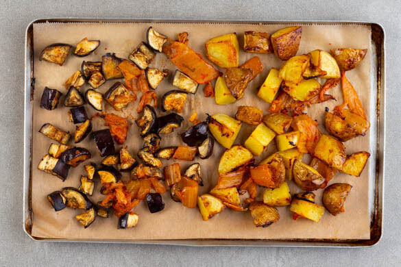 Die Kartoffeln samt Schale in grobe Würfel schneiden. Die Aubergine in ca. 2cm große Würfel schneiden. Die Auberginen, die Kartoffeln und das Kimchi auf mit Backpapier ausgelegtes Backblech geben.