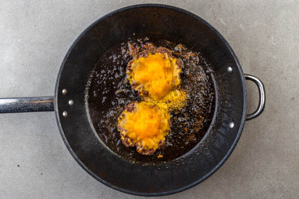 Den Käse gleichmäßig auf den Pattys verteilen, dann die Hitze auf die niedrigste Stufe reduzieren, 2EL Wasser in die Pfanne geben und die Pattys abgedeckt ca. 1Min. weitergaren, bis der Käse geschmolzen ist.