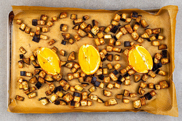 Die Aubergine in ca. 1cm große Würfel schneiden. Die Orange in 4 Spalten schneiden. Die Auberginenwürfel mit 2EL Olivenöl, dem Spekulatiusgewürz sowie je 1 kräftigen Prise Salz und Pfeffer auf einem mit Backpapier ausgelegten Backblech vermengen. 3 Orangenspalten mit etwas Öl aus der Form einreiben, zwischen den Auberginen platzieren und alles 15–20Min. im Ofen backen.