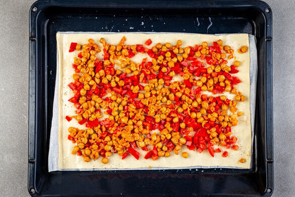 Die Tomaten fein würfeln. Die Teige mit dem Papier nach unten auf zwei Backblechen ausrollen. Mit jeweils 1EL Olivenöl beträufeln, mit je 1 Prise Salz und Pfeffer und den Tomaten bestreuen. Mit den Kichererbsen belegen, dabei die zerstampften Kichererbsen leicht in den Teig drücken. Im Ofen in 9–12Min. goldbraun backen, zur Hälfte der Zeit die Position der Bleche tauschen.