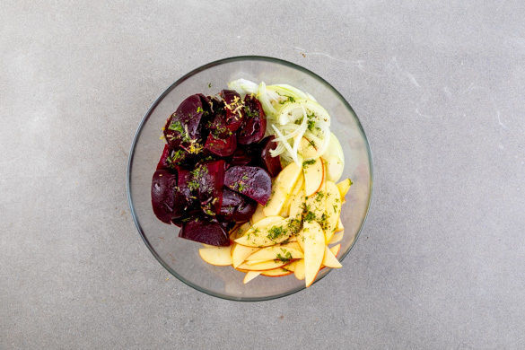 In einer großen Schüssel den Zitronensaft und -abrieb, 2EL Olivenöl sowie 2EL Essig zu einem Dressing verrühren und mit Salz und Pfeffer abschmecken. Die Zwiebeln, die Äpfel, die Rote Bete und den Dill vorsichtig mit dem Dressing vermengen.