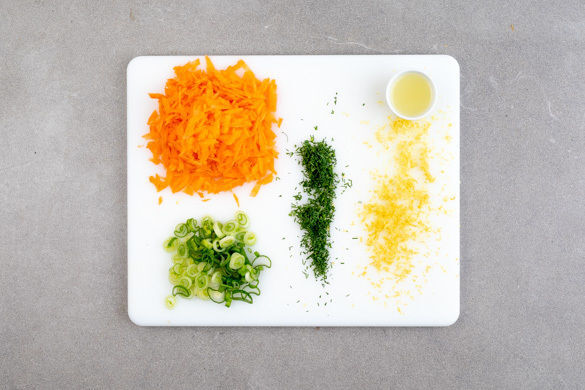 Die Zitronenschale fein abreiben, dann die Zitrone halbieren und auspressen. Die Dillspitzen abzupfen und fein schneiden. Die Lauchzwiebel in feine Ringe schneiden. Die Karotte ggf. schälen und mit einer Küchenreibe grob raspeln.