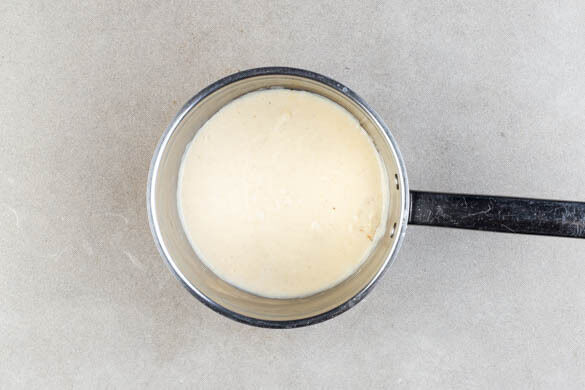 In einem mittelgroßen Topf 4EL Butter bei mittlerer Hitze schmelzen lassen. 4EL Mehl darüberstäuben, unter Rühren 1–2Min. andünsten. Vorsichtig 400ml Milch, 350ml Wasser und das übrige Brühgewürz einrühren und die Hitze leicht erhöhen. Unter regelmäßigem Rühren 4–5Min. leicht blubbernd köcheln lassen, bis die Béchamel recht flüssig vom Löffel rinnt, dann mit Salz und Pfeffer abschmecken.