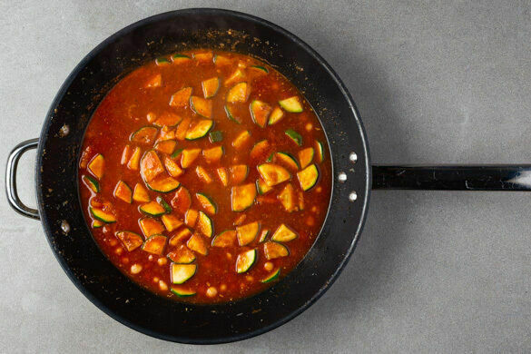 Die Gewürzmischung und je 1 Prise Salz und Pfeffer unter das Gemüse rühren. Das Tomatenmark einrühren und 500ml heißes Wasser angießen. Das Curry einmal aufkochen und dann bei mittlerer Hitze 4–5Min. köcheln lassen, bis die Zucchini weich ist.