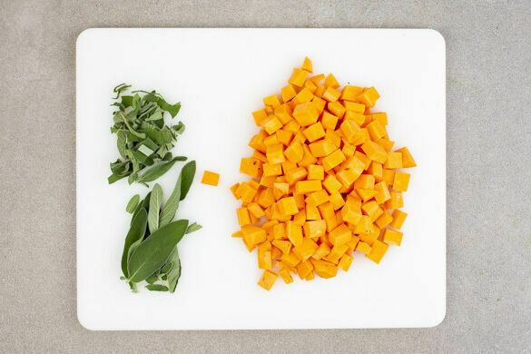 In einem großen Topf ausreichend gesalzenes Wasser für die Süßkartoffeln und den Brokkoli zum Kochen bringen. Die Süßkartoffeln schälen und in kleine Würfel schneiden. Die Salbeiblätter abzupfen und ca. ⅓ der Salbeiblätter grob schneiden.