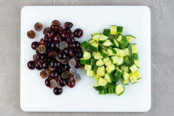 Die ½ der Weintrauben halbieren. Tipp: Die restlichen Weintrauben zum Frühstück im Müsli genießen. Die Gurke längs vierteln und in ca. 1cm große Würfel schneiden.