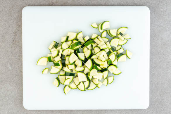 Die Zucchini längs vierteln und quer in dünne Scheiben schneiden.