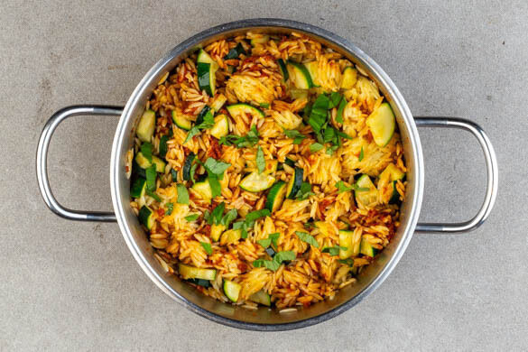 Oh ja, da geben wir dir recht: Risoni sehen wirklich wie Reis aus. Es handelt sich aber tatsächlich um eine Sorte Pasta – die man durchaus auch lauwarm oder kalt verzehren kann. So wie heute zum Beispiel: verfeinert mit veganem Thunfisch, gebratenen Zucchini und einem aromatischen Tomaten-Oliven-Pesto. Als Beilage gibt es einen würzigen Gurkensalat, den du vorher geschmeidig einlegst. Wir wünschen guten Appetit!