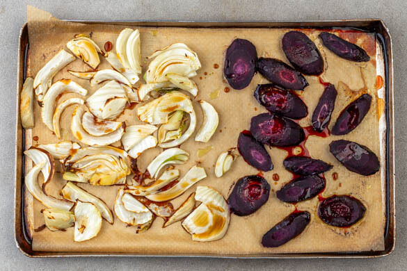 3EL Balsamicoessig und 1½EL Honig verrühren. Die Karotten und den Fenchel mit jeweils der ½ der Balsamicoglasur vermengen, wieder gleichmäßig verteilen und ca. 5Min. weiterbacken, bis das Gemüse leicht karamellisiert ist.