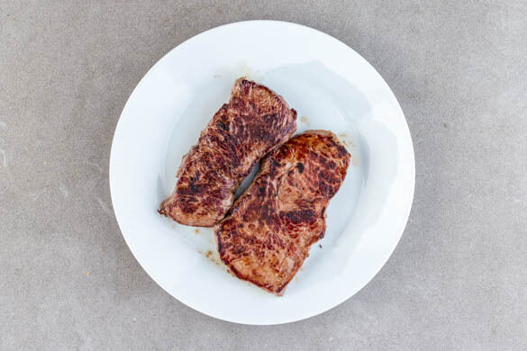 Das Fleisch trocken tupfen und in einer mittelgroßen Pfanne mit 1EL Olivenöl bei starker Hitze auf jeder Seite 2–3Min. braten, abhängig davon, ob es medium oder eher durchgebraten sein soll. Das Fleisch aus der Pfanne nehmen und abgedeckt auf einem Teller ruhen lassen. Die Pfanne wird weiterverwendet. Den Mais in dicke Scheiben schneiden.