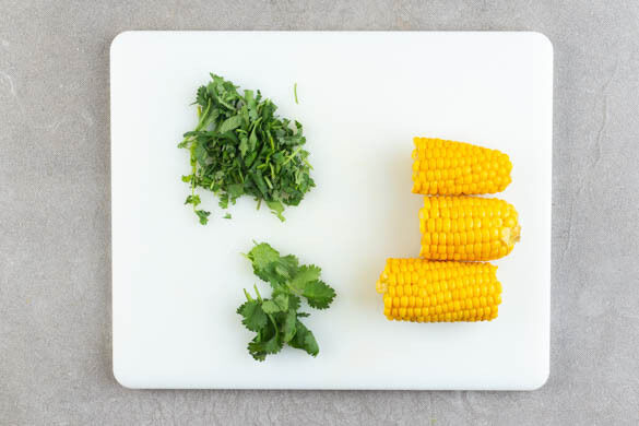 Den Mais aus dem kochenden Wasser nehmen und kalt abspülen. Einige Korianderblätter für die Garnitur beiseitelegen, dann den übrigen Koriander samt Stängeln grob schneiden.