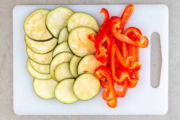 Den Backofen auf 220°C (200ºC Umluft) vorheizen. In einem mittelgroßen Topf 600ml leicht gesalzenes Wasser für den Reis zum Kochen bringen. Die Auberginen in ca. 0,5cm dicke Scheiben schneiden. Die Paprika halbieren, entkernen und in dünne Streifen schneiden.