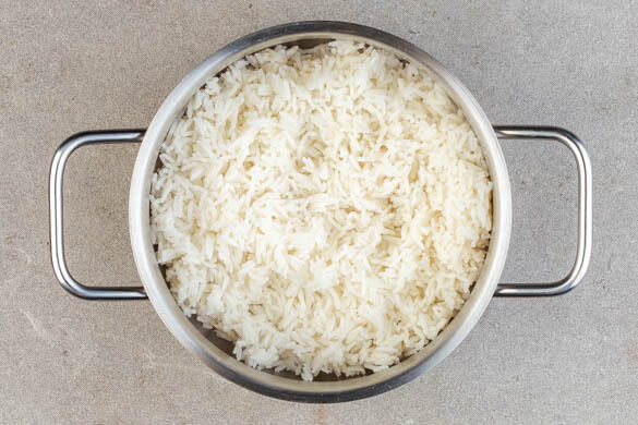 Den Reis in einem Sieb kalt abspülen, bis das Wasser klar bleibt. Sobald das Wasser kocht, den Reis hineingeben und abgedeckt bei niedrigster Hitze 12–14Min. kochen, bis das Wasser aufgesogen und der Reis gar ist. Noch ca. 5Min. ohne Hitzezufuhr ziehen lassen und bis zum Servieren abgedeckt warm halten.
