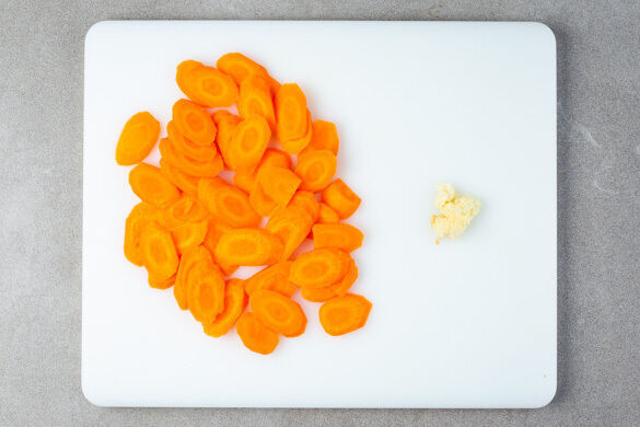 Die Karotte ggf. schälen und leicht schräg in hauchdünne Scheiben schneiden. Den Knoblauch schälen und fein würfeln.
