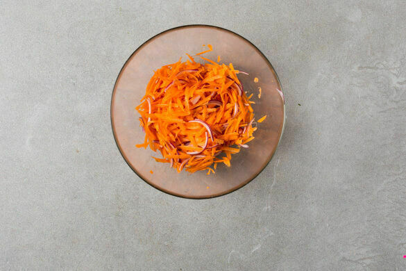 Die Karotten ggf. schälen und grob raspeln. Die Zwiebel schälen, halbieren und in dünne Streifen schneiden. Tipp: Wer keine rohen Zwiebeln mag, kann die Zwiebelstreifen vor der weiteren Verwendung ca. 5Min. in heißem Wasser einweichen.