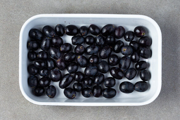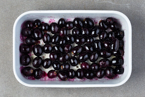 Den Backofen mit Grillfunktion oder Ober-/Unterhitze auf 250°C vorheizen. In einem mittelgroßen Topf ausreichend Wasser für die Pasta zum Kochen bringen und das Brühgewürz einrühren. Die ½ der Weintrauben abzupfen und in eine ausreichend große Auflaufform geben. Tipp: Die übrigen Weintrauben z. B. zum Frühstück genießen.