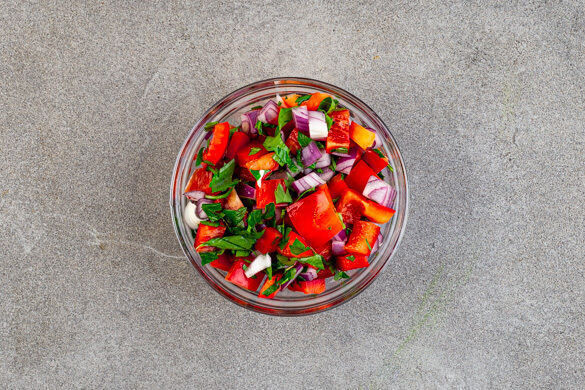 Die Paprika halbieren, entkernen und in ca. 1cm kleine Würfel schneiden, dann mit den restlichen Zwiebeln, 2EL Essig und dem restlichen Koriander vermengen. Mit Salz abschmecken.