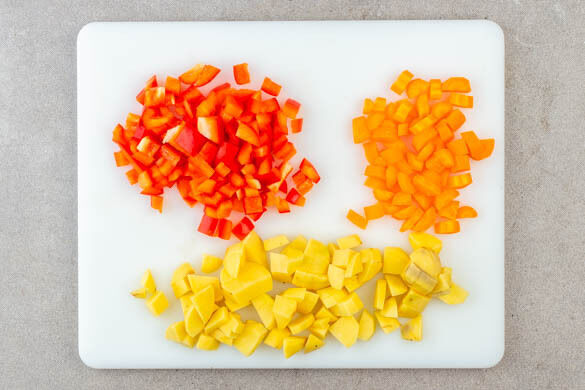 Die Kartoffeln schälen und in ca. 1cm große Würfel schneiden. Die Karotte ggf. schälen, längs halbieren und in ca. 1cm große Würfel schneiden. Die Paprika vierteln, entkernen und ebenfalls in ca. 1cm große Stücke schneiden.