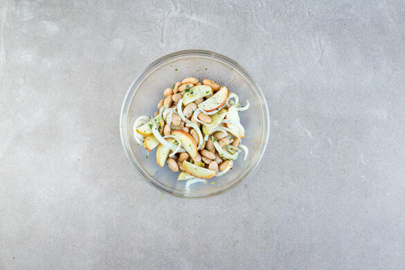 Die Bohnen in einem Sieb mit kaltem Wasser abspülen, abtropfen lassen und mit der ½ des Dressings vermengen. Den gerösteten Fenchel und die Apfelscheiben unterheben und ggf. mit Salz und Pfeffer abschmecken.