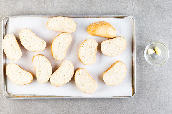 Den Backofen auf 240°C (220°C Umluft) vorheizen. In einem kleinen Topf ausreichend Wasser für die Eier zum Kochen bringen. Den Knoblauch schälen und eine Hälfte fein würfeln. Das Brötchen in Scheiben schneiden und auf einem mit Backpapier ausgelegten Backblech 6–8Min. im Ofen goldbraun rösten. Anschließend abkühlen lassen.