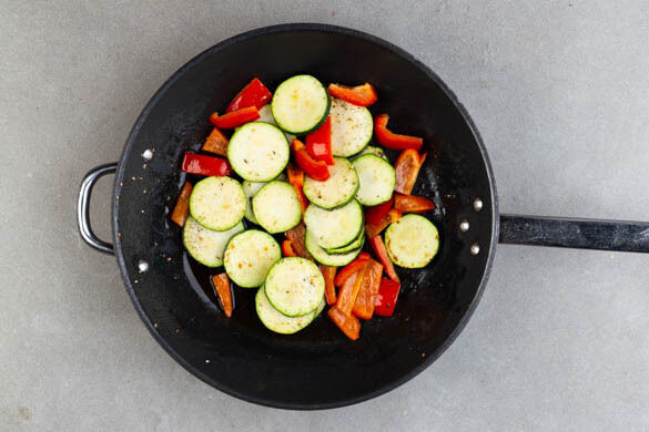Die Paprika und die Zucchini in einer großen Pfanne mit 1EL Olivenöl und der Gewürzmischung bei mittlerer Hitze unter gelegentlichem Rühren 7–8Min. braten, bis das Gemüse gar, aber noch etwas bissfest ist. Mit Salz und Pfeffer abschmecken.
