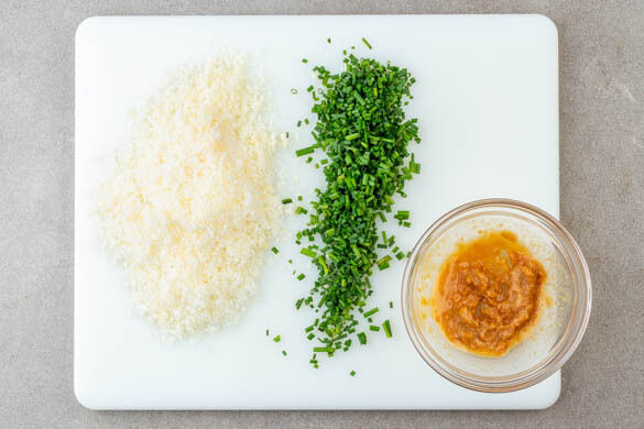 Den Käse grob reiben. Die Misopaste mit 1EL Nudelwasser glatt rühren. Den Schnittlauch in dünne Ringe schneiden.