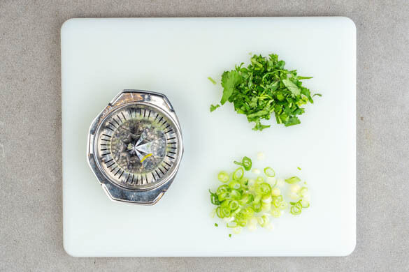 Inzwischen die Lauchzwiebel in feine Ringe schneiden. Den Koriander fein schneiden. Die Limette halbieren und auspressen.