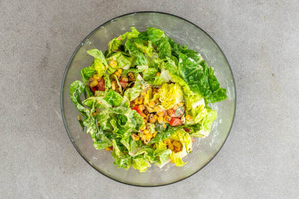 Den Romanasalat in ca. 2cm breite Streifen schneiden. Die Tomate grob würfeln. Den Romanasalat und die Tomaten mit dem Mais vermengen.