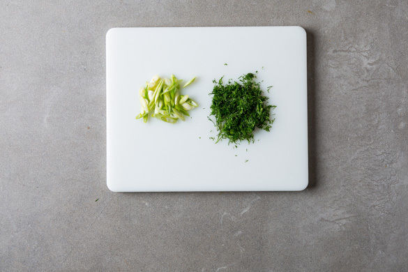 Den Dill samt Stängeln fein schneiden. Die Lauchzwiebeln schräg in dünne Ringe schneiden.